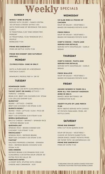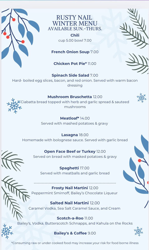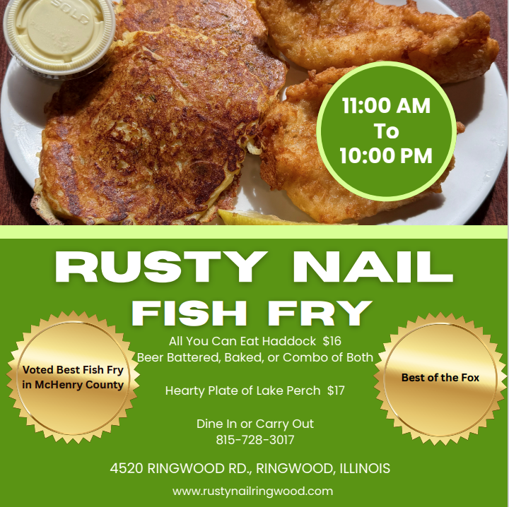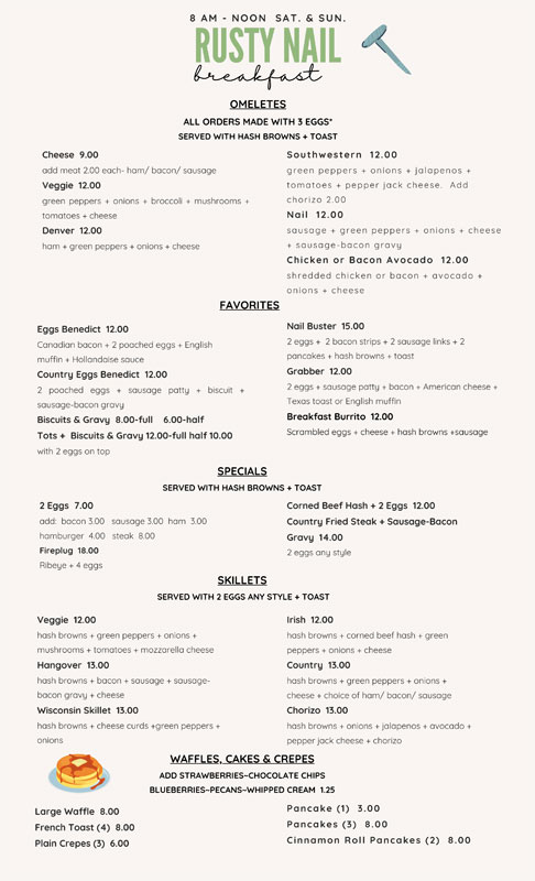 Rusty Nail Saloon in Ringwood has an extensive menu of delicious food for dining in and catering. Start your day with one of our breakfast items, such as an egg special, skillet, omelet, or pancakes. Our menu ranges from appetizers, burgers, and fine dining dishes. We also have nightly specials, including half-priced pizza, BBQ ribs, broasted chicken, prime rib, and more. Then on Friday have our county’s best fish fry, all you can eat haddock. In the mood for Mexican? Stop in on Tuesdays for our Taco Tuesday menu, with tacos, burritos, and quesadillas available with several types of meat, with optional chips and salsa or guacamole. Check out our full menus below.